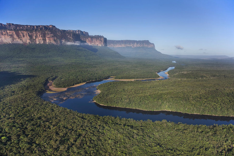 Gran Sabana ở Venezuela, Nam Mỹ nằm trên một cao nguyên ở độ cao 1.000 mét so với mực nước biển và được bao phủ bởi các ngọn núi lớn, được gọi là tepuis, vươn lên so với đồng bằng xung quanh.