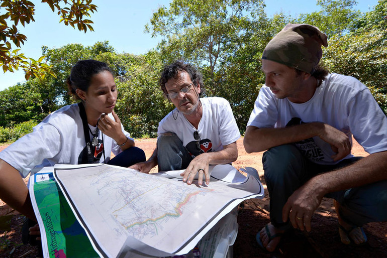 Ba người tham gia cuộc thám hiểm năm 2013 kiểm tra bản đồ và các tuyến đường để thực hiện công việc thực địa.