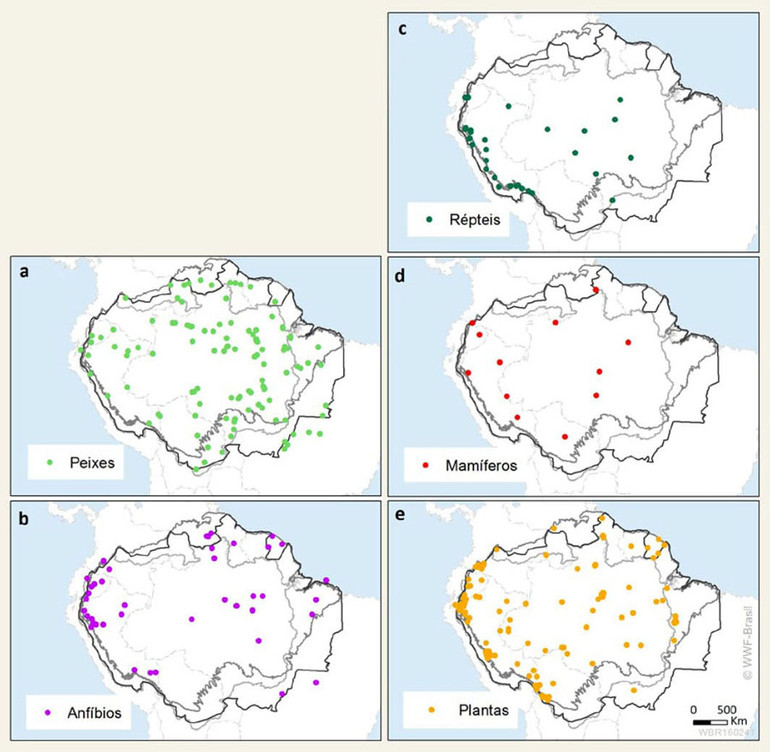 Bản đồ thể hiện vị trí của 292 loài được phát hiện từ năm 2014 đến năm 2015 theo các nhóm: (a) cá; (b) lưỡng cư; (c) loài bò sát; (d) động vật có vú; và (e) thực vật.