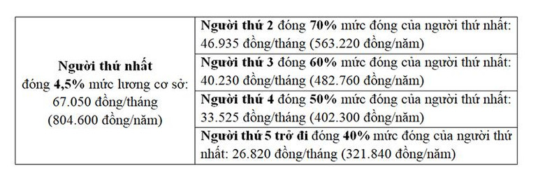 Với quy định này, khi số người trong hộ gia đình tham gia bảo hiểm y tế càng đồng, mức giảm trừ sẽ càng cao. Cụ thể, với người thứ năm trở đi tham gia, cá nhân chỉ phải đóng 40% mức đóng của người thứ nhất, tương đương 26.820 đồng/tháng, tức là 321.840 đồng/năm. Lý do là người thứ nhất hiện chỉ đóng 4,5% mức lương cơ sở, tương đương 67.050 đồng/tháng, tức 804.600 đồng/năm.