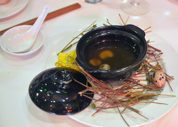 Món soup yến từ đảo Cù Lao Chàm (Quảng Nam), một món ăn bổ dưỡng, tinh tuý, món quà quý từ miền biển huyền thoại dành tặng cho con người. Soup yến được dọn trong thố gốm màu đen, làm nổi bật những sợi yến mầu hổ phách cùng nước dùng thanh trong, ngọt mát.