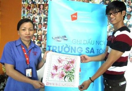 Chị lao công Nguyễn Thị Tuyết Sương rất bất ngờ và vui mừng khi bức tranh thêu của mình được chọn ghi dấu ấn nơi Trường Sa. Chị Sương chia sẻ, chị đã ấp ủ một ước muốn tạo nên một món quà thật ý nghĩa của riêng mình. Vì vậy, tranh thủ những giờ giải lao, chị đã chăm chút từng đường kim mũi chỉ để thêu nên một tranh hoa, để gửi gắm những tình cảm của mình đến đồng bào nơi đảo xa.