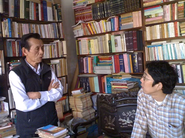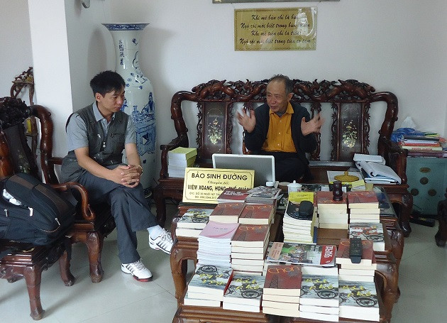 Ông Cảnh (bên trái) trong kho sách của gia đình.