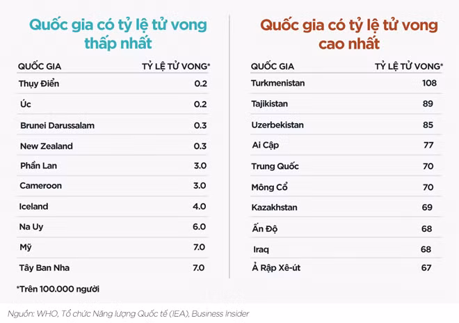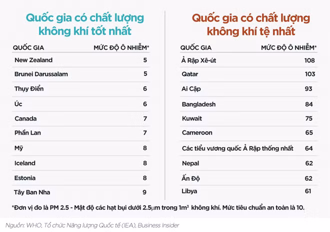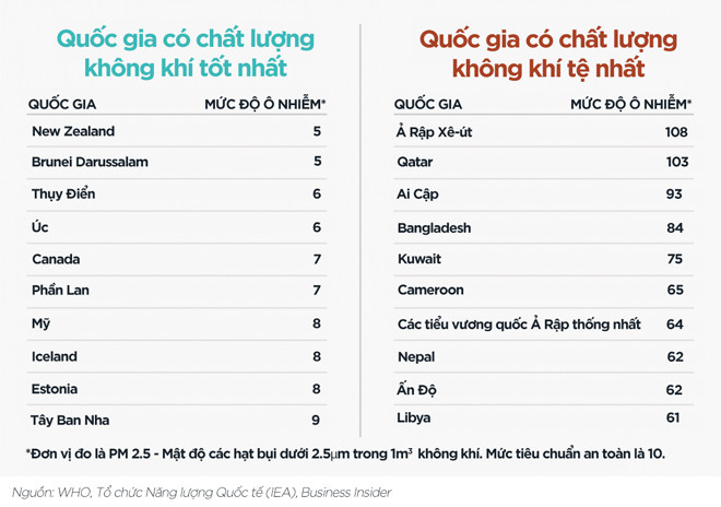Những con số dưới đây cho thấy tình trạng môi trường trên thế giới với các khía cạnh về tiêu thụ, sử dụng năng lượng, mức độ ô nhiễm không khí, theo dữ liệu của Tổ chức Y tế thế giới (WHO) và Cơ quan Năng lượng quốc tế (IEA).
