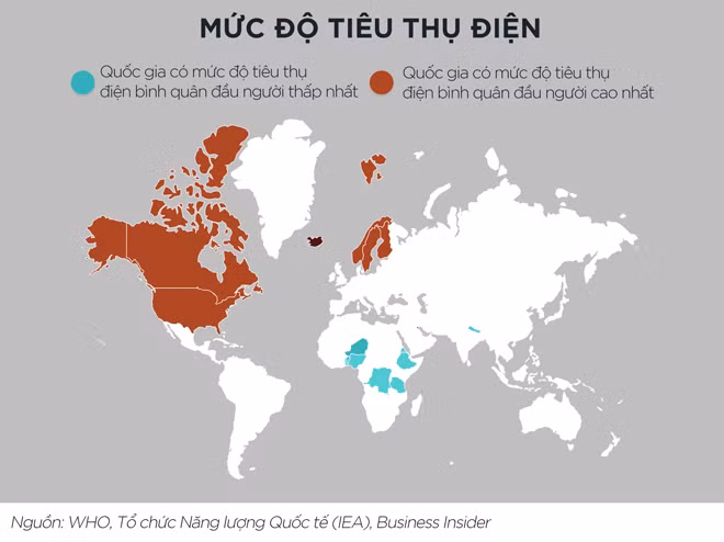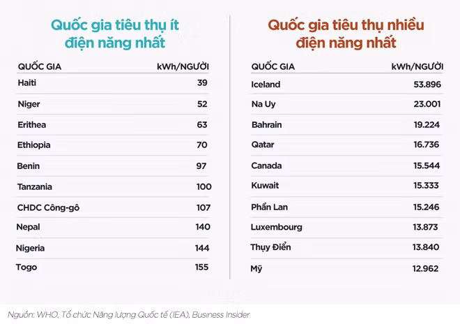 Với những dữ liệu về tiêu thụ điện, nguyên nhân lý giải cũng tương tự với tỷ lệ carbonic thải ra môi trường. Các quốc gia thuộc tốp dưới xét về mức độ lớn mạnh của nền kinh tế thường sử dụng ít điện năng hơn, bởi không phải tất cả người dân ở những quốc gia này được tiếp cận với nguồn điện quốc gia một cách đầy đủ và liên tục.