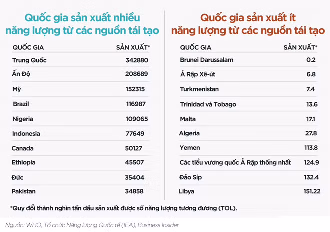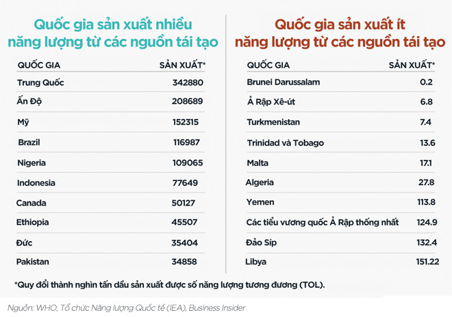 Mặc dù bị đánh giá không cao về chất lượng không khí cũng như việc tiết kiệm trong sử dụng năng lượng, nhưng Trung Quốc, Ấn Độ và Mỹ là ba quốc gia đầu bảng về sử dụng các nguồn năng lượng tái tạo.