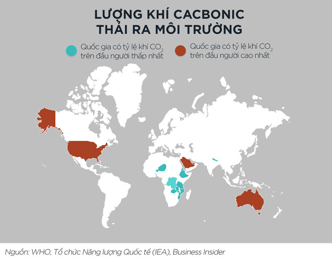 Điều này lý giải cho việc đa số các quốc gia trong tốp thải khí thải ra môi trường ít nhất đều là những nước kém phát triển và đang phát triển, tập trung nhiều ở khu vực Trung Phi.