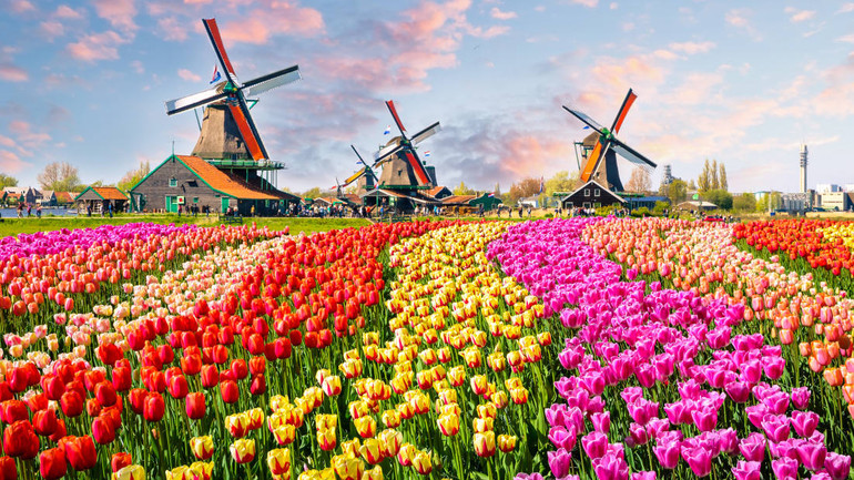 Hình ảnh ngoại ô kinh điển với cánh đồng hoa và cối xay gió của Hà Lan tại Zaanse Schans, một khu phố ở thị trấn Zaandamwith của Hà Lan.
