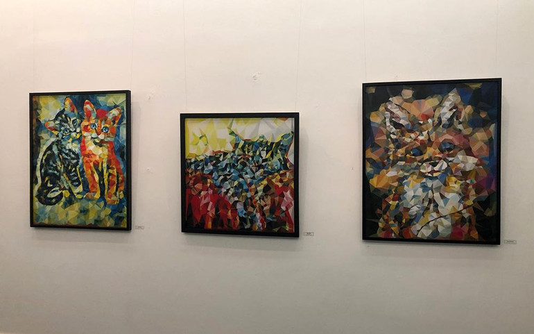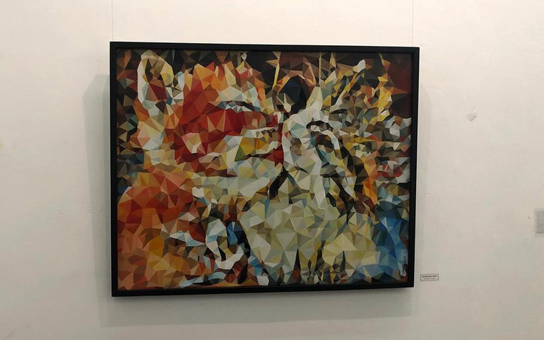 Điều đặc biệt nhất là những bức tranh được vẽ theo kiểu polygon, nhìn gần là tranh trừu tượng, nhưng nếu đứng ngắm từ xa, sẽ thấy rõ hình hài, đường nét của những đóa hoa, những con vật ngộ nghĩnh xinh xắn.