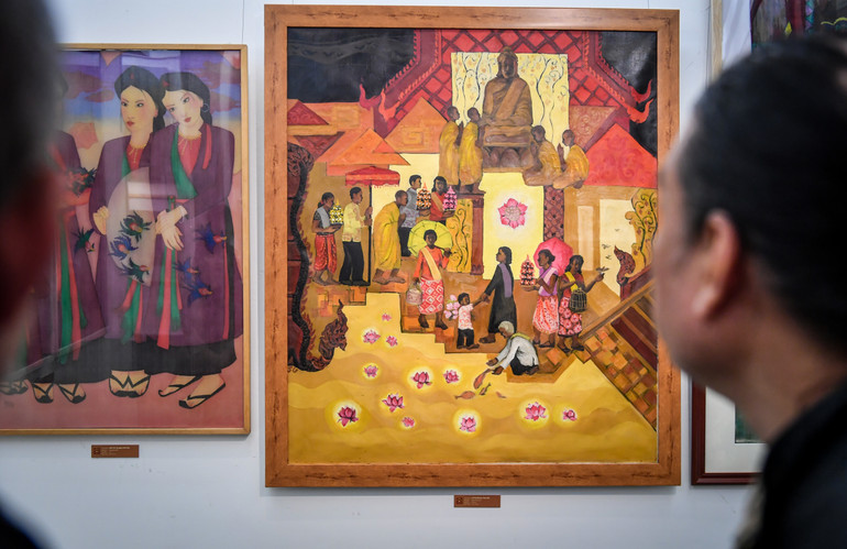 Hoặc bức "Thêu váy mùa xuân" của tác giả trẻ Dương Đức Thịnh sử dụng chất liệu lụa, nhưng chi tiết chiếc vòng bạc nổi bật như chất liệu bạc thật trên tác phẩm.