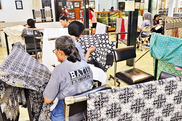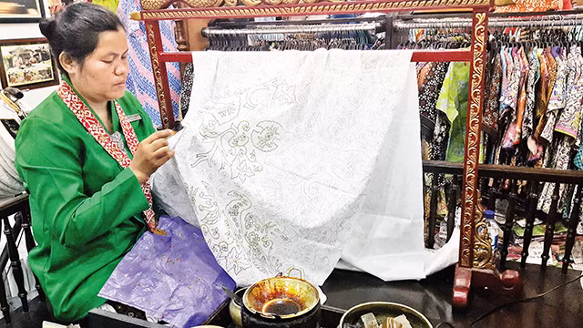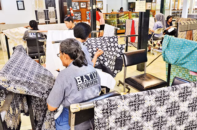 Lang thang dọc con phố chính Malioboro san sát các cửa hàng thời trang batik, đồ lưu niệm làm từ batik từ cao cấp tới bình dân. Tại cửa hàng đồ batik lớn nhất phố, khách du lịch thích thú khi được tận mắt thấy thợ batik đang vẽ các họa tiết bằng sáp ong nóng chảy (công đoạn này được gọi là “canting”, bước đầu tiên để tạo ra một mảnh vải batik). Chị Ngadiningsih, người đã tập làm nghề từ lúc mới tám tuổi, miệt mài, khéo léo đưa nhẹ chiếc bút canting (dụng cụ vẽ batik có một đầu như ngòi bút, bên trên có gắn một cái phễu nhỏ đựng sáp ong chảy) nói: “Để hoàn thành bản vẽ sáp ong trên tấm vải dài 2m với những họa tiết đơn giản phải mất ba tuần, nếu bản vẽ nhiều chi tiết hơn, công đoạn vẽ có thể kéo dài ít nhất bốn tuần. Và phải mất ít nhất một tháng để cho ra đời một tấm vải batik hoàn thiện, có những tấm vải phải mất tới một năm với nhiều người cùng tham gia”.