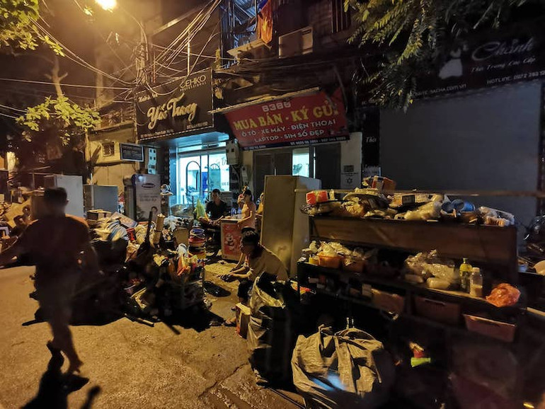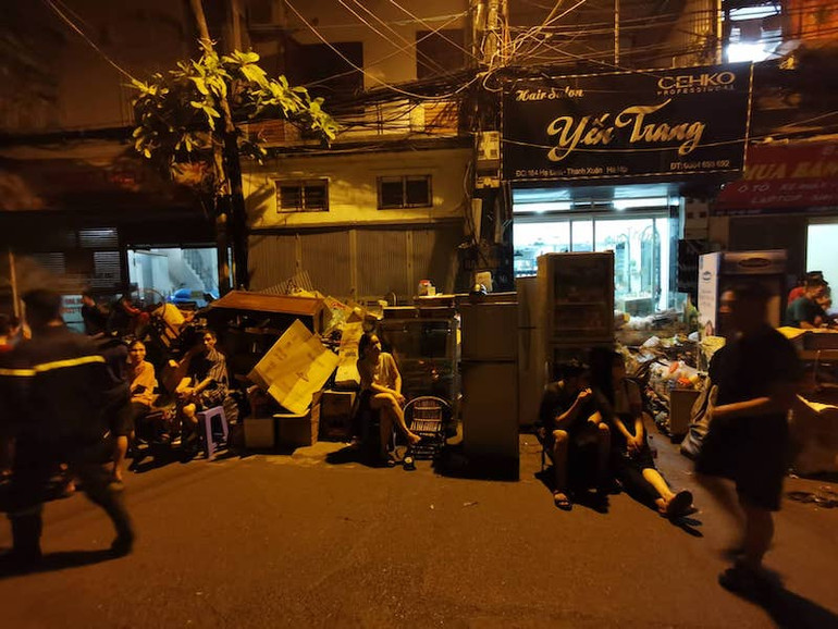 Hơn 23 giờ, người dân cùng đồ đạc sơ tán ngổn ngang ngoài đường phố.