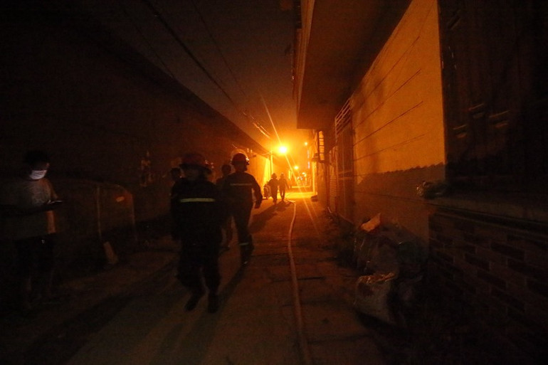 Ghi nhận của PV tại hiện trường, cho thấy, các xe chuyên dụng vẫn tiếp nước đều để chữa cháy, lực lượng chữa cháy đã tiếp cận một số khu vực gần nhà dân để làm mát nhằm ngăn đám cháy lan sang. Các nhà dân chung quanh khu vực cháy đã sơ tán hết người và đồ đạc, tài sản.