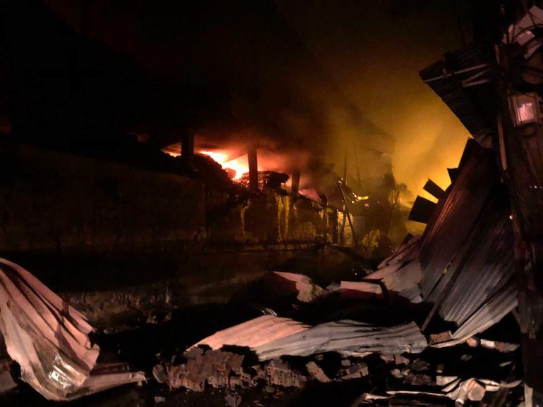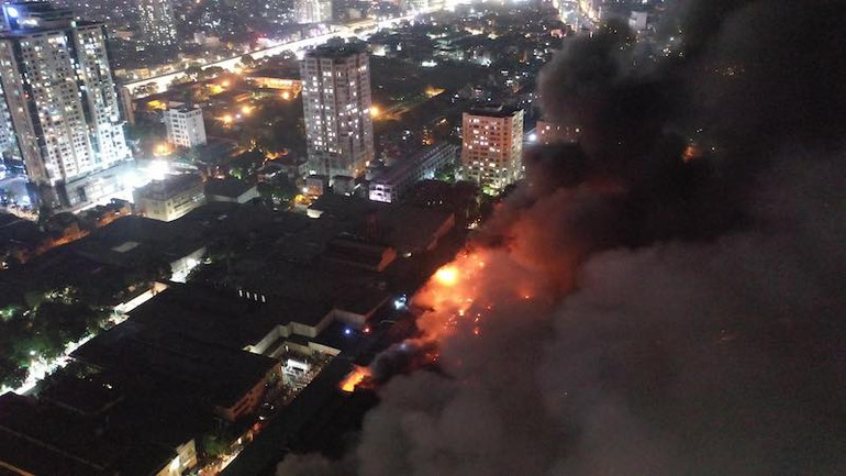 Khoảng 22 giờ, hình ảnh chụp từ trên cao bằng flycam cho thấy, cột khói vẫn bốc cao từ đám cháy.