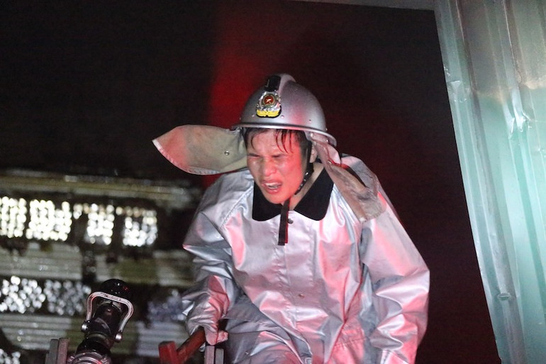 Thiếu uý Nguyễn Văn Thắng thuộc Đội cứu hộ cứu nạn Đống Đa sau gần bốn tiếng chiến đấu với đám cháy.