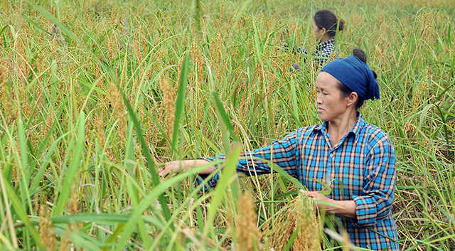 Nông dân xã Ngọc Côn (huyện Trùng Khánh) thu hoạch lúa mùa. Ảnh: VŨ TIỆP