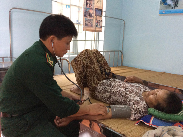 Y sĩ Trạm quân - dân y kết hợp khám bệnh cho người dân buôn Drang Phôk. Ảnh: HƯƠNG THU