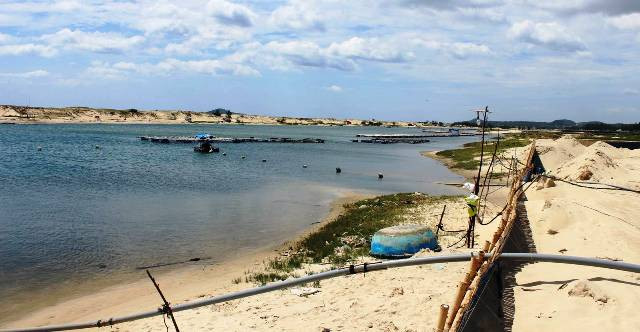 Người nuôi tôm ngang nhiên đặt máy bơm hút cát, xây dựng công trình cải tạo hồ nuôi tôm cao triều một cách công khai, trong khi chính quyền khẳng định đã kiểm tra ngăn chặn.