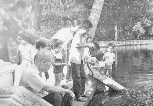 Gia đình bà Nguyễn Thị Bích Thuận thăm ao cá Bác Hồ.