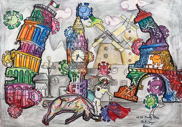 Tác phẩm của Chung Anh, 10 tuổi, cho thấy các sự kiện liên quan đến dịch bệnh đã diễn ra trên toàn cầu như thế nào. Những bức vẽ của cô bé mô tả sự tàn phá của virus thông qua những địa danh như Tháp Eiffel, tượng Nữ thần tự do, đồng hồ Big Ben và tháp nghiêng Pisa khi dịch bệnh lan rộng khắp châu Âu, Mỹ và hơn thế nữa.