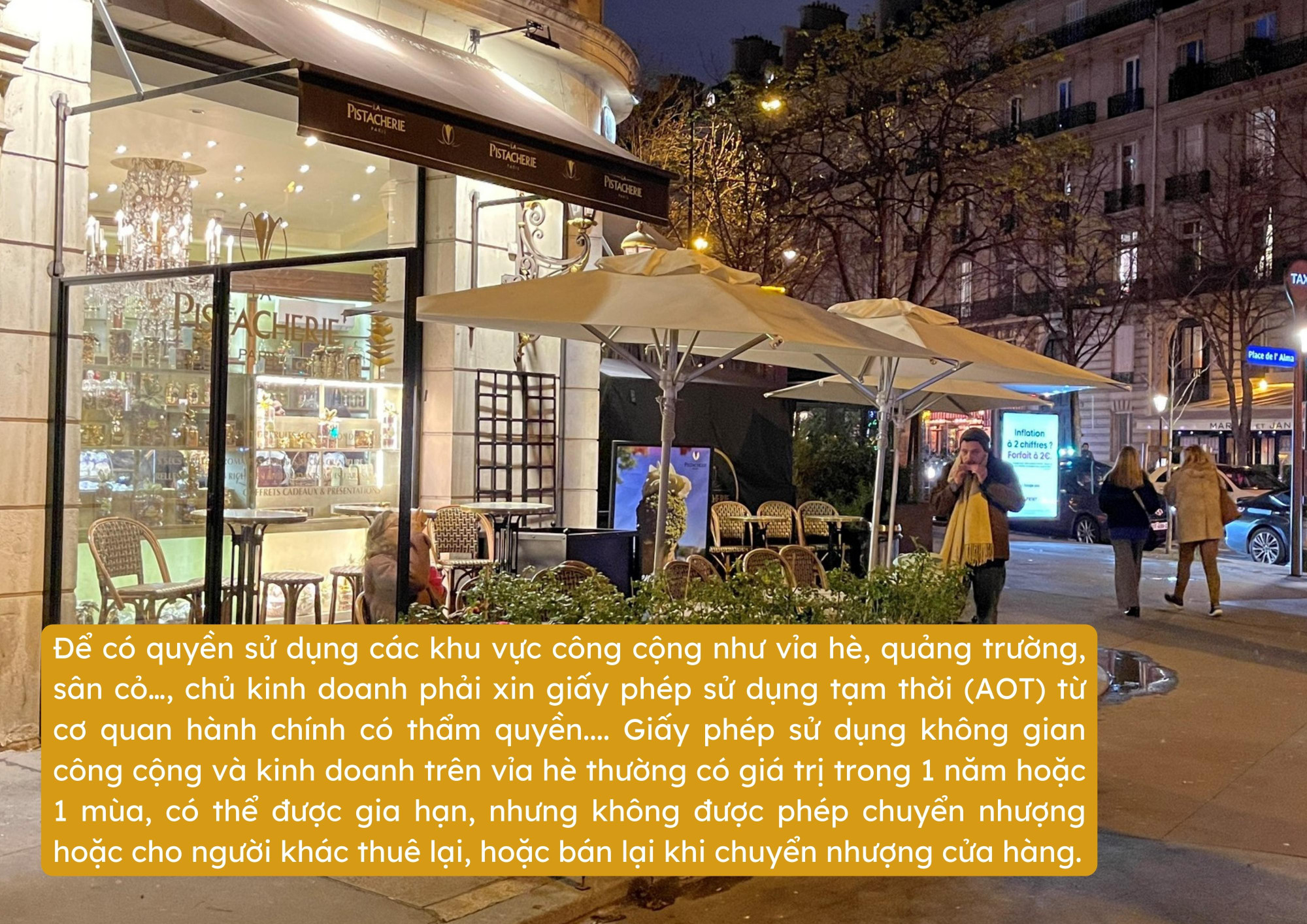 Nói tóm lại, việc chiếm giữ bất hợp pháp không gian công cộng cho một hoạt động thương mại là không được phép ở Pháp và có thể bị trừng phạt. Do đó, các chủ kinh doanh nên tuân thủ các quy định của địa phương và có được các giấy phép cần thiết trước khi bắt đầu hoạt động thương mại trên vỉa hè.