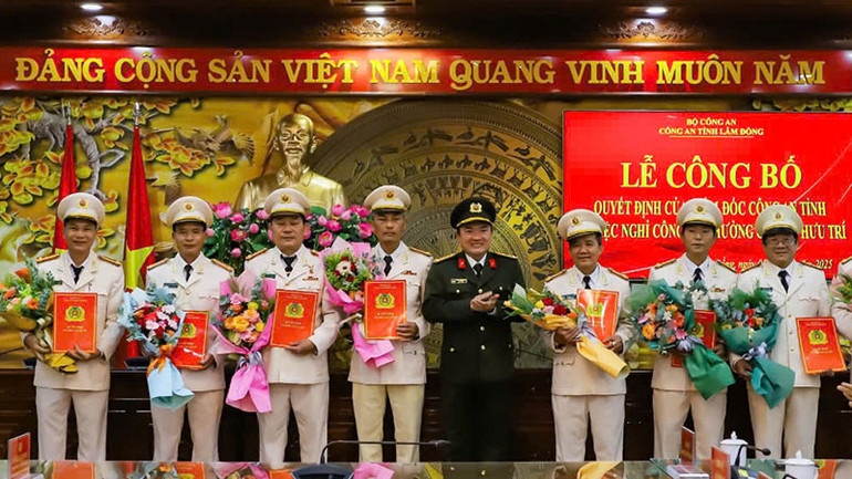 | Lãnh đạo Công an tỉnh Lâm Đồng trao quyết định cho các đồng chí nghỉ hưu. |