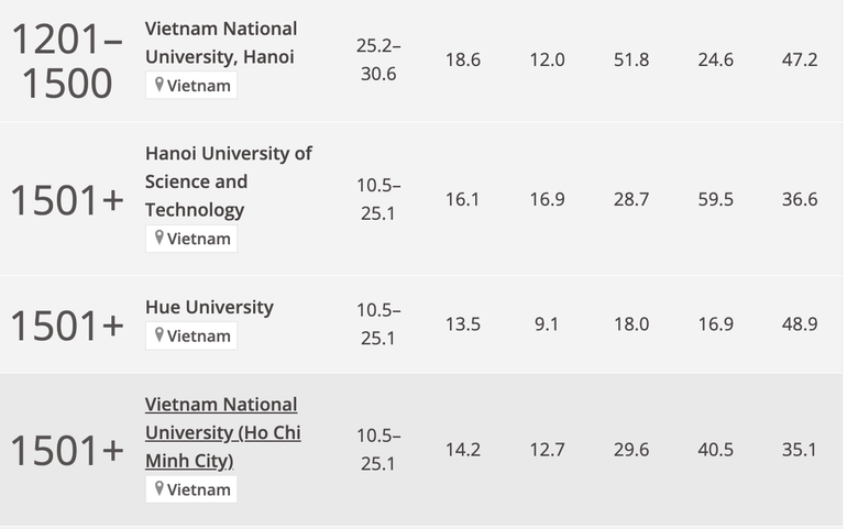 Các cơ sở giáo dục đại học Việt Nam có tên trong Xếp hạng đại học thế giới Times Higher Education 2025 là: Trường đại học Kinh tế Thành phố Hồ Chí Minh (University of Economics Ho Chi Minh City -UEH); Đại học Duy Tân (Duy Tan University); Trường đại học Tôn Đức Thắng (Ton Duc Thang University -TDTU); Trường đại học Y Hà Nội (Hanoi Medical University); Trường đại học Mở Thành phố Hồ Chí Minh (Ho Chi Minh City Open University); Đại học Quốc gia Hà Nội (Vietnam National University, Hanoi); Đại học Bách khoa Hà Nội (Hanoi University of Science and Technology); Đại học Huế (Hue University); Đại học Quốc gia Thành phố Hồ Chí Minh (Vietnam National University, Ho Chi Minh City).