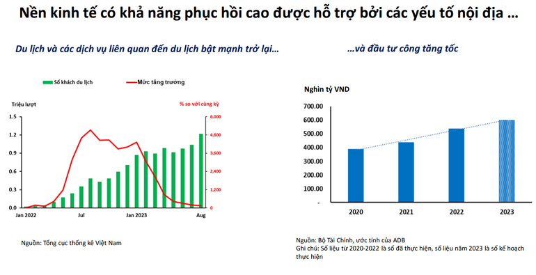 Theo ADB, đầu tư công sẽ là động lực chính cho phục hồi và tăng trưởng kinh tế trong năm 2023. Đầu tư nước ngoài có dấu hiệu phục hồi bất chấp suy thoái kinh tế toàn cầu, với vốn FDI cam kết tính tới tháng 8/2023 là 18,2 tỷ USD, tăng 8,2% so với cùng kỳ năm ngoái và giải ngân vốn FDI tăng nhẹ ở mức 1,3%, đạt 13,1 tỷ USD.