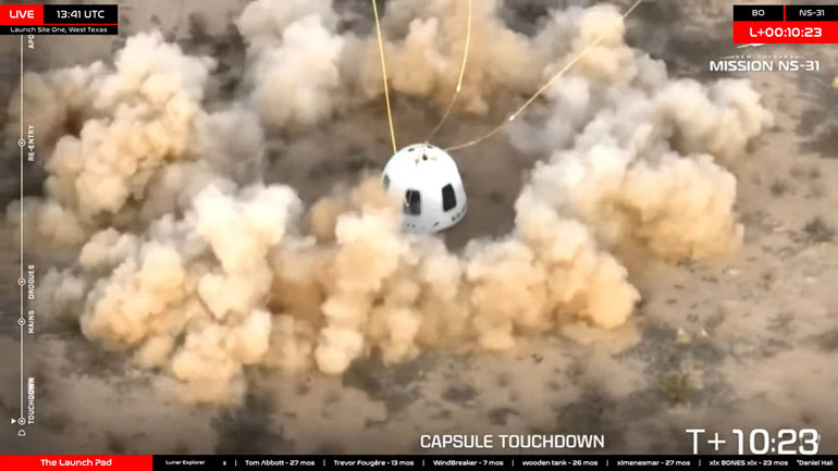 | Cabin chở 6 phi hành gia hạ cánh an toàn sau chuyến bay kéo dài 11 phút vào vũ trụ. |