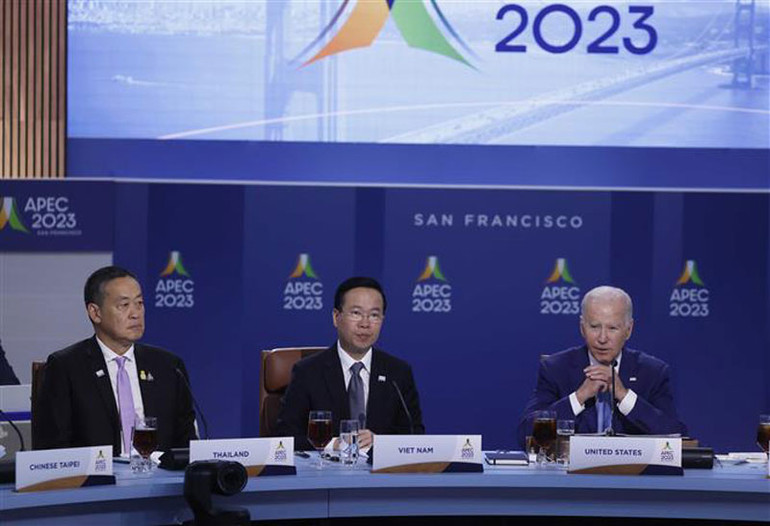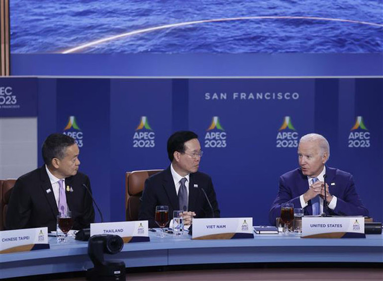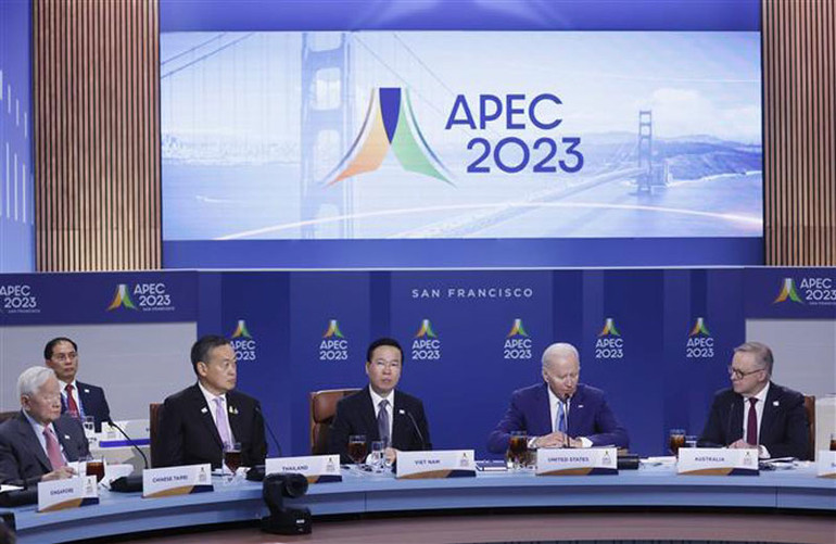 | Chủ tịch nước Võ Văn Thưởng và các Nhà lãnh đạo APEC tại buổi làm việc. (Ảnh: TTXVN) |