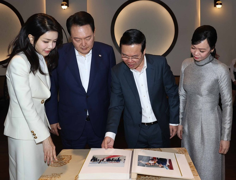 Chủ tịch nước Võ Văn Thưởng và Phu nhân cùng Tổng thống Hàn Quốc Yoon Suk Yeol và Phu nhân xem ảnh về chuyến thăm cấp Nhà nước tới Việt Nam của Tổng thống Hàn Quốc Yoon Suk Yeol. (Ảnh: Thống Nhất/TTXVN)