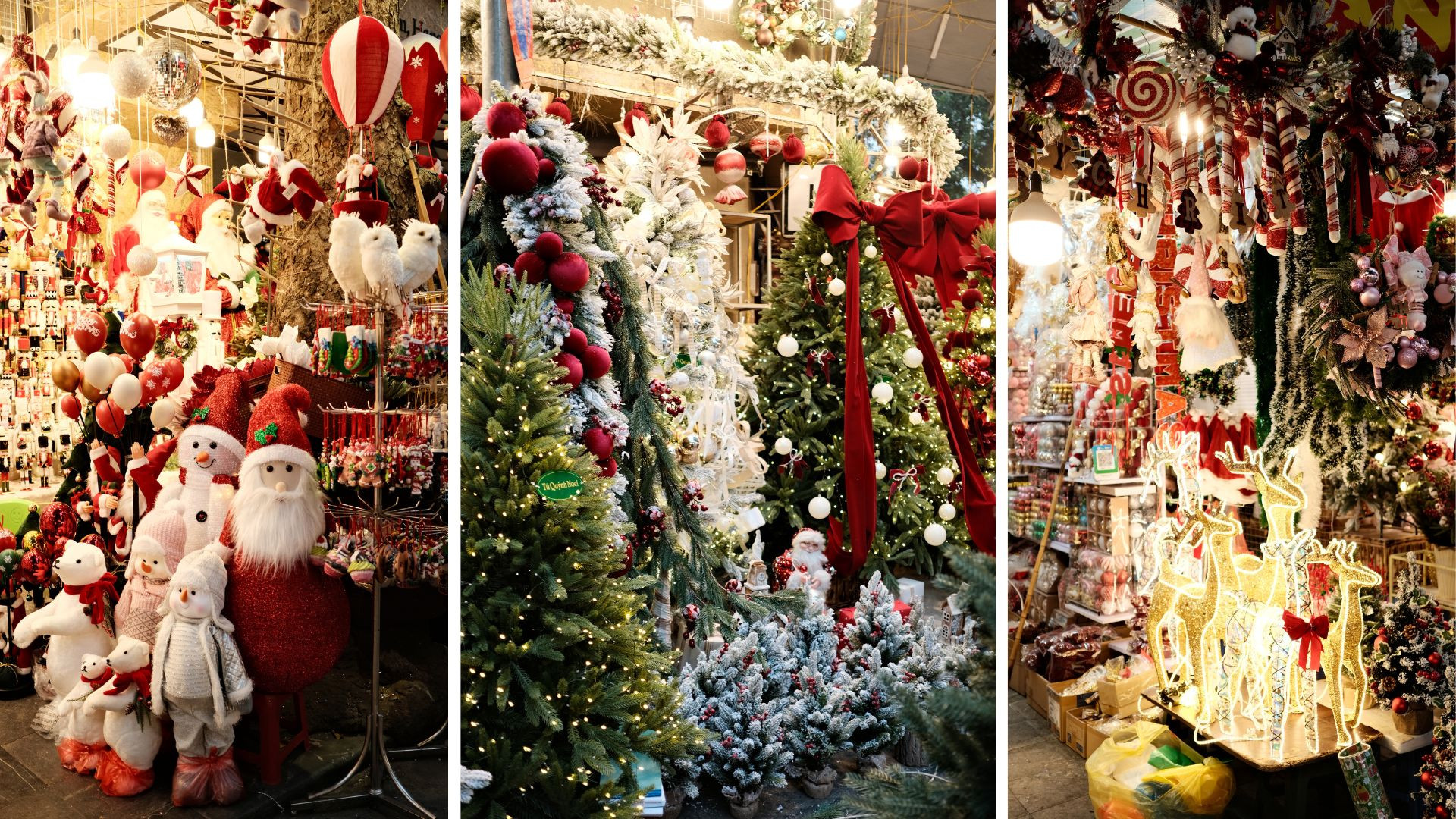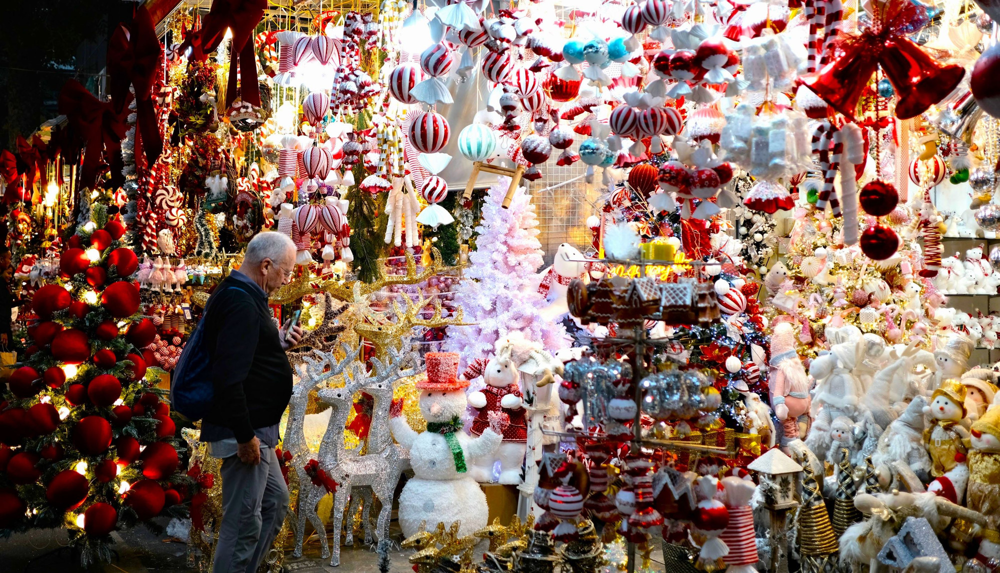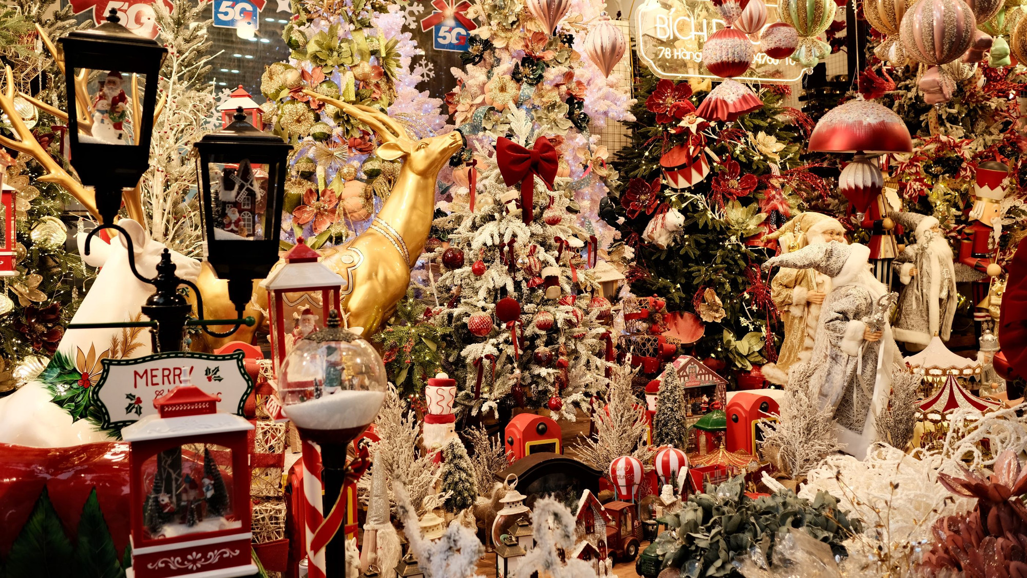 Cây thông Noel, vòng nguyệt quế, người tuyết, ông già Noel, và những chuỗi đèn led rực rỡ phủ kín các cửa hàng.