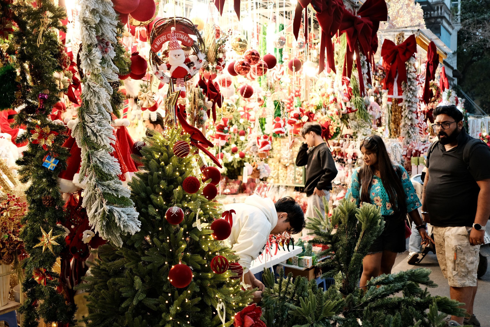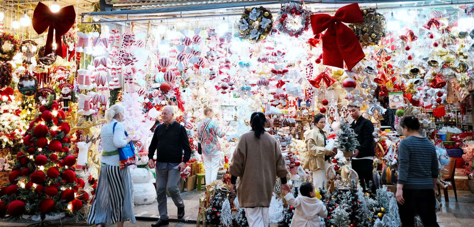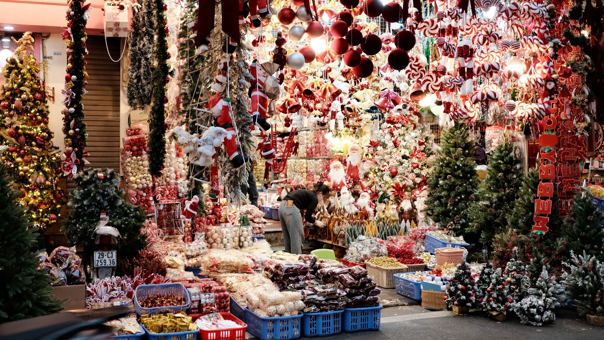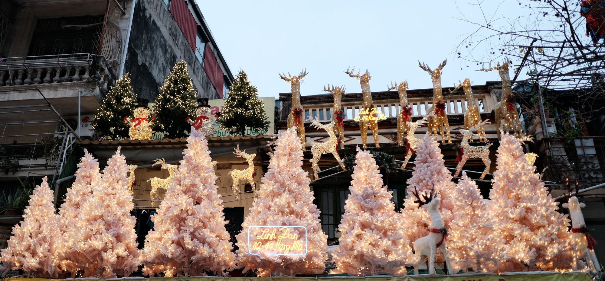 Cây thông Noel, vòng nguyệt quế, người tuyết, ông già Noel, và những chuỗi đèn led rực rỡ phủ kín các cửa hàng.