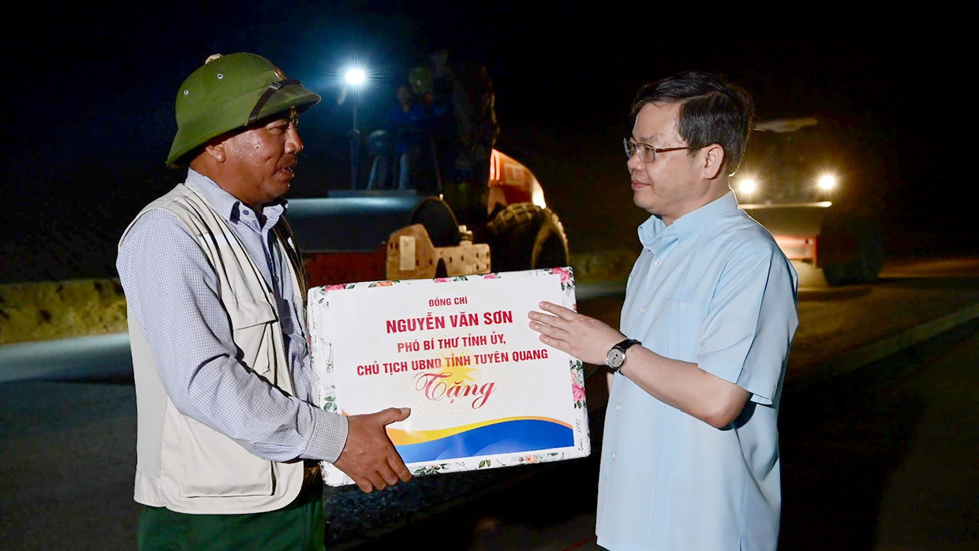 Đồng chí Nguyễn Văn Sơn, Chủ tịch UBND tỉnh Tuyên Quang tặng quà lực lượng thi công cao tốc trong đêm. Hoạt động gặp gỡ, động viên và chỉ đạo tháo gỡ khó khăn các đơn vị thực hiện trong quá trình thi công cũng được địa phương chú trọng thực hiện.
