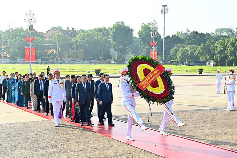 | Các đồng chí lãnh đạo Đảng, Nhà nước thành kính tưởng nhớ công lao to lớn của Chủ tịch Hồ Chí Minh. |