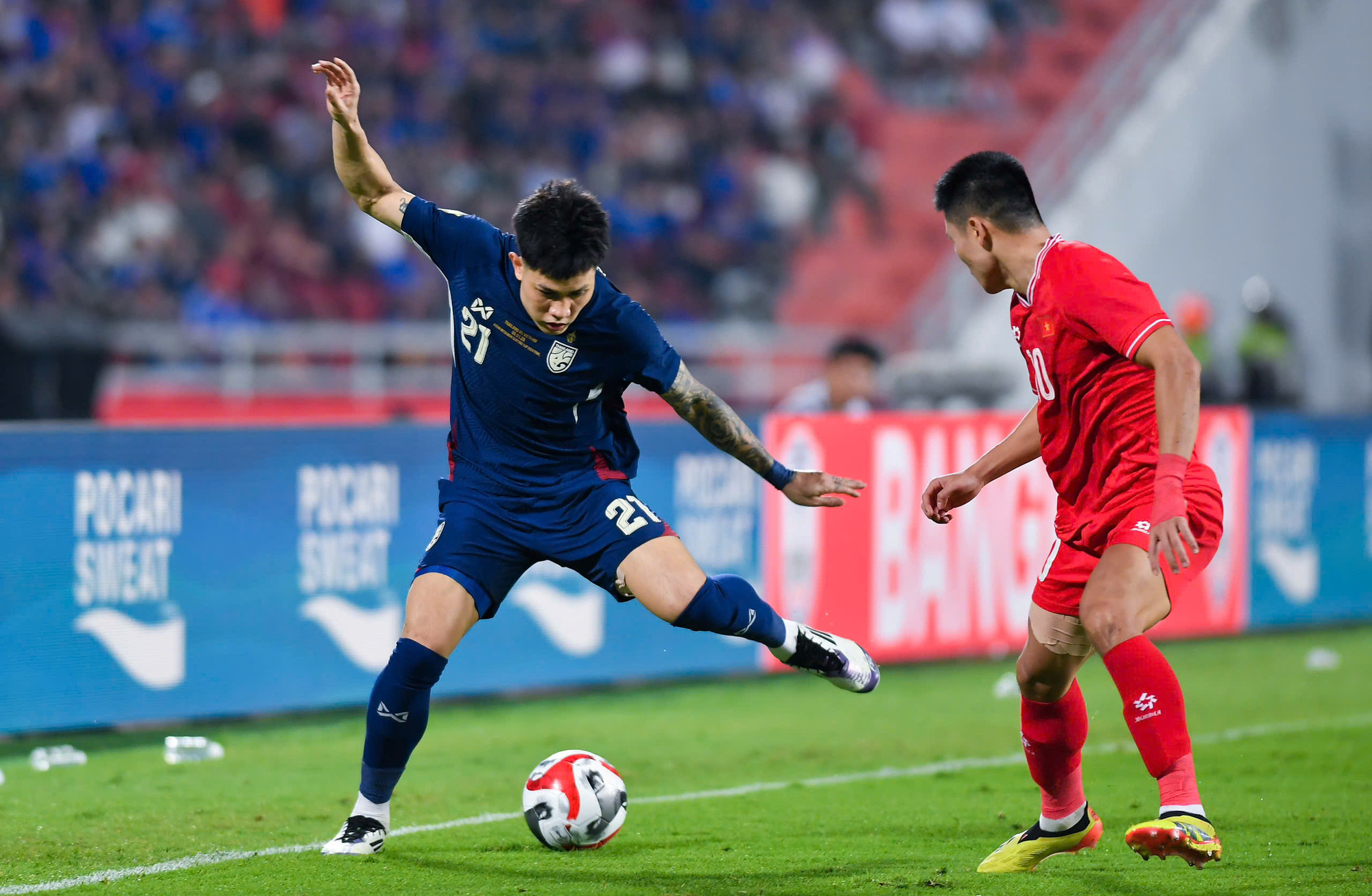 | Hơn một nửa hiệp 1 trôi qua, Thái Lan kiểm soát bóng đến 74%. Tuy nhiên, đội chủ nhà đang bế tắc trong tấn công. |