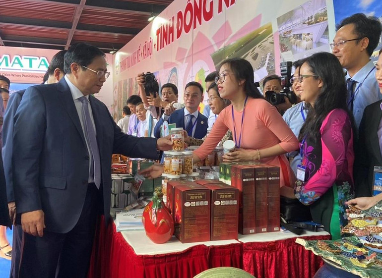 Thủ tướng Phạm Minh Chính và các đại biểu tham quan gian hàng trưng bày các sản phẩm của các tỉnh, thành phố trong vùng Đông Nam Bộ.
