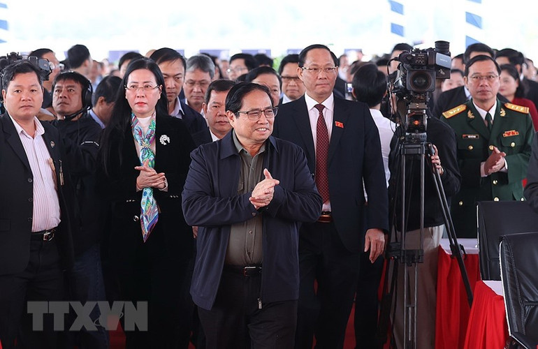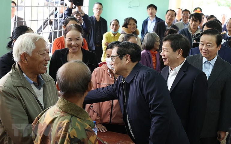 Thủ tướng Phạm Minh Chính đến thăm, động viên các hộ dân phải di dời để giải phóng mặt bằng cho tuyến cao tốc bắc-nam phía đông. (Ảnh: Dương Giang/TTXVN)