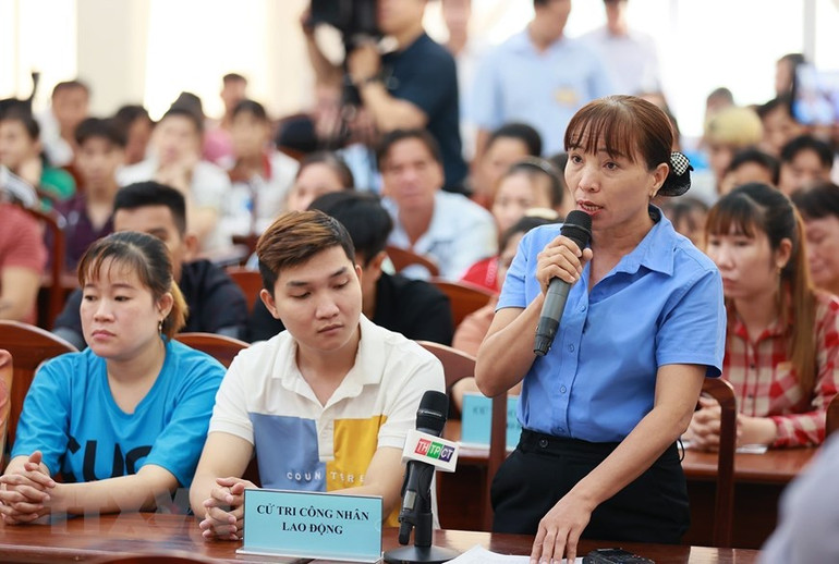 Cử tri Nguyễn Thị Hòa đại diện công nhân lao động nêu ý kiến. (Ảnh: TTXVN)