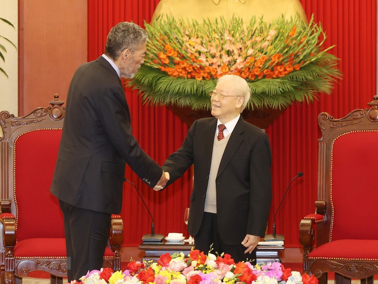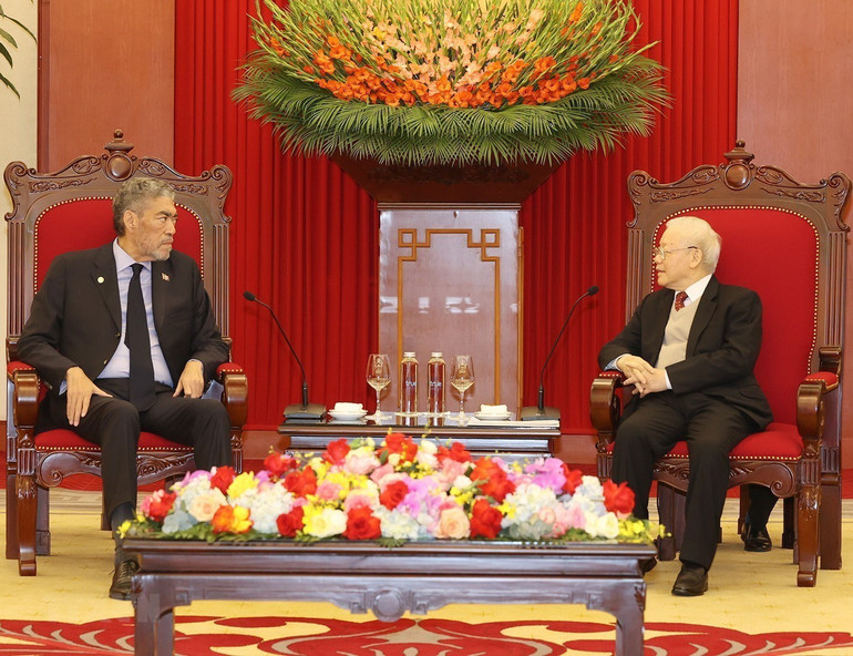 | Tổng Bí thư Nguyễn Phú Trọng tiếp Tổng Bí thư Đảng Phong trào Cánh tả Thống nhất Cộng hòa Dominica. (Ảnh: TTXVN) |