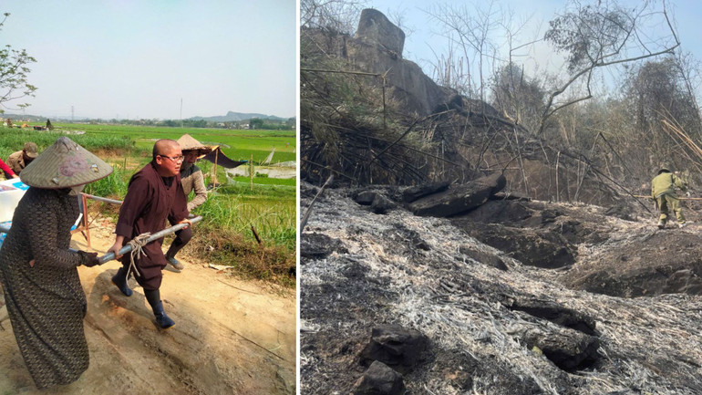Các lực lượng đã phải đi bộ xuyên rừng khoảng 3km, dùng sức người để xây dựng gần 1km đường băng chia lửa tại ba điểm khống chế đám cháy và chữa cháy xuyên đêm.