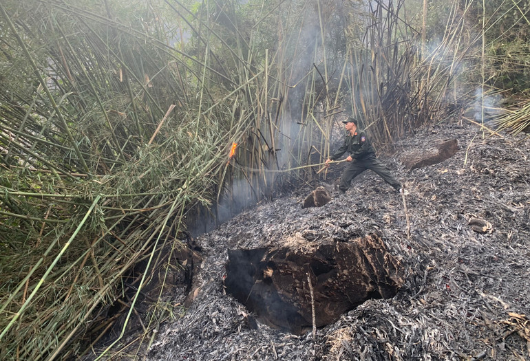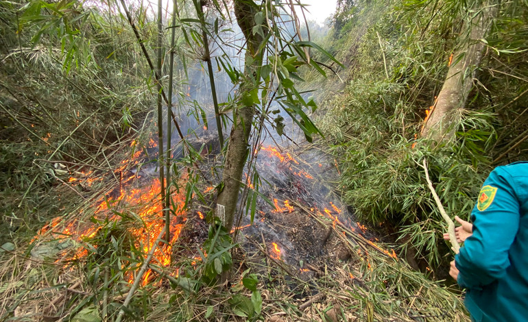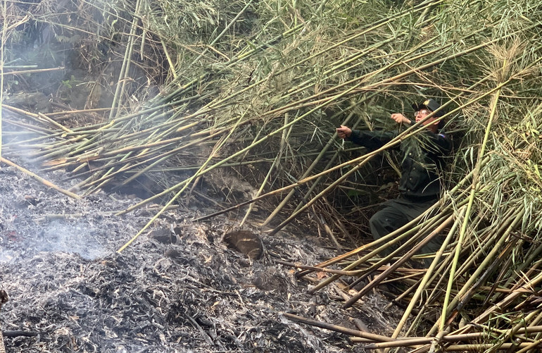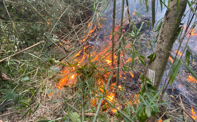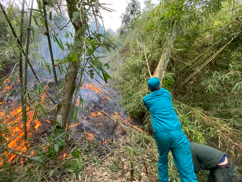 Diện tích rừng cháy là rừng tre, nứa, thảm thực vật dày, thời tiết hanh khô gây rất nhiều khó khăn cho việc khoanh vùng, ngăn chặn lửa lan rộng.