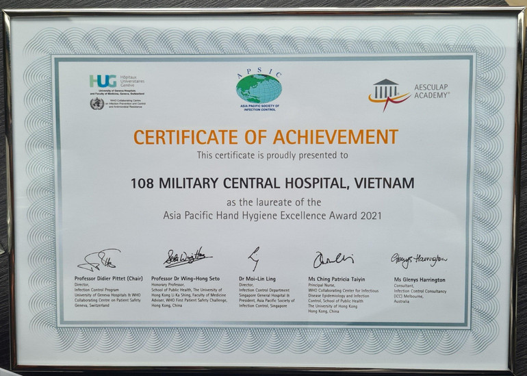 Ngày 2/6, sau khi trải qua quy trình thẩm định nghiêm ngặt, chứng minh qua những số liệu, hình ảnh thực tế trong báo cáo 5 năm, Bệnh viện Trung ương Quân đội 108 đã vinh dự trở thành 1 trong 5 đơn vị chiến thắng nhận giải thưởng vệ sinh tay xuất sắc châu Á-Thái Bình Dương năm 2021 tại hội nghị APSIC 2022 diễn ra từ ngày 28 đến 31/7 tại Singapore bên cạnh các nước Nhật Bản, Malaysia, Thái Lan, Ấn Độ.