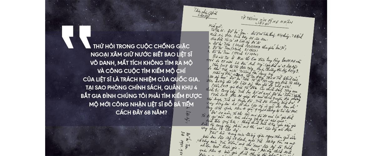 10 năm, gần 4.000 ngày ròng rã cầm lá đơn viết tay đi khắp các nơi, ông Toan thuộc làu từng câu chữ mình viết, trong đó có những câu hỏi đầy nhức nhối: “Thử hỏi trong cuộc chống giặc ngoại xâm giữ nước biết bao liệt sĩ vô danh, mất tích không tìm ra mộ và công cuộc tìm kiếm mộ chí của liệt sĩ là trách nhiệm của quốc gia. Tại sao Phòng chính sách, Quân khu 4 bắt gia đình chúng tôi phải tìm kiếm được mộ mới công nhận liệt sĩ Đỗ Bá Tiềm cách đây 68 năm?”.