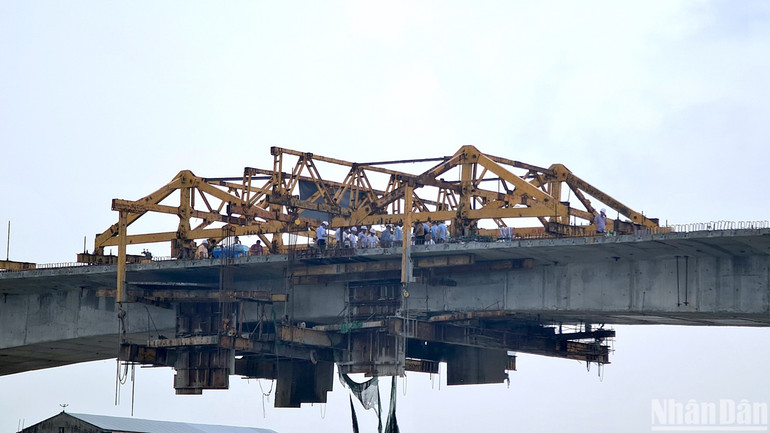 | Lãnh đạo tỉnh Cà Mau và các đơn vị liên quan chứng kiến công đoạn hợp long cầu bắt qua sông Ông Đốc. |