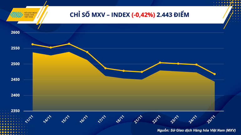 Theo Sở Giao dịch Hàng hóa Việt Nam (MXV), thị trường hàng hóa đóng cửa tuần giao dịch vừa qua (21/11-27/11) với lực bán chiếm ưu thế. Chỉ số MXV-Index giảm 0,42% xuống 2.443 điểm, đánh dấu tuần giảm thứ 3 liên tiếp.