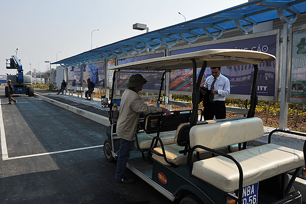 Để đi lại giữa hai nhà ga T1 và T2, hành khách có thể lựa chọn phương tiện di chuyển là những chiếc xe điện như thế này, với giá vé chỉ 7.000 đồng/khách.
