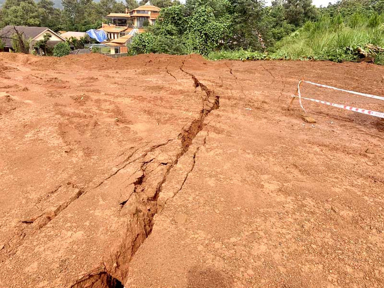 Dọc theo điểm sụt lún, xuất hiện vết nứt khoảng 100m qua vườn cà-phê người dân.