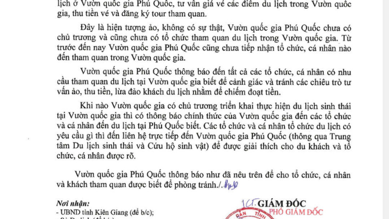 Ông Huỳnh Văn Tiến, Phó Giám đốc Vườn quốc gia Phú Quốc cho biết, Vườn thông báo đến tất cả các tổ chức, cá nhân có nhu cầu tham quan, du lịch tại Vườn biết để cảnh giác và tránh các chiêu trò tư vấn giả mạo, thu tiền, lừa đảo du khách du lịch nhằm chiếm đoạt tiền.