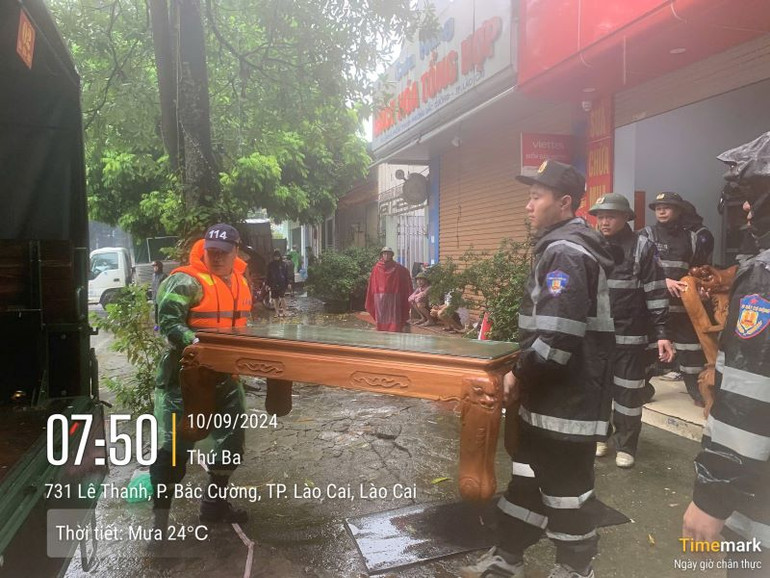 Tại phường Cốc Lếu (thành phố Lào Cai), Trung tá Nguyễn Trung Thành, Tiểu đoàn trưởng D4 Trung đoàn Tây Bắc, Bộ Tư lệnh Cảnh sát cơ động cho biết: Ngay sau khi có hiện tượng thiên tai xảy ra, theo đề nghị của chính quyền địa phương và chỉ đạo của Bộ Tư lệnh, chúng tôi đã điều 100 cán bộ, chiến sĩ có mặt ngay tại hiện trường, nhanh chóng di dời tài sản, người đến nơi an toàn, cũng như tiến hành cứu người tại những khu vực ngập úng. Hiện tại, chỗ ngập sâu nhất tại Lào Cai là hơn 2m, vẫn còn một số người dân mắc kẹt tại các ngôi nhà chưa đưa ra khỏi đó được, chúng tôi vẫn đang tiếp tục phối hợp với các cơ quan chức năng để nhanh chóng đưa người dân đến nơi an toàn.
